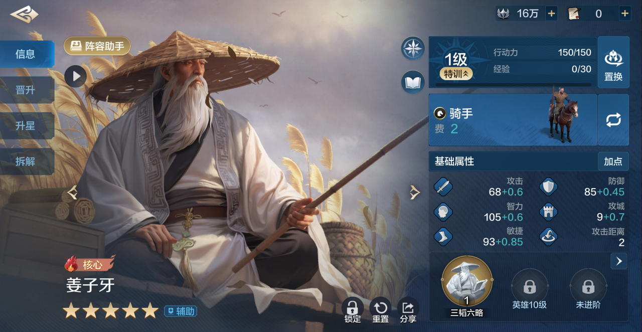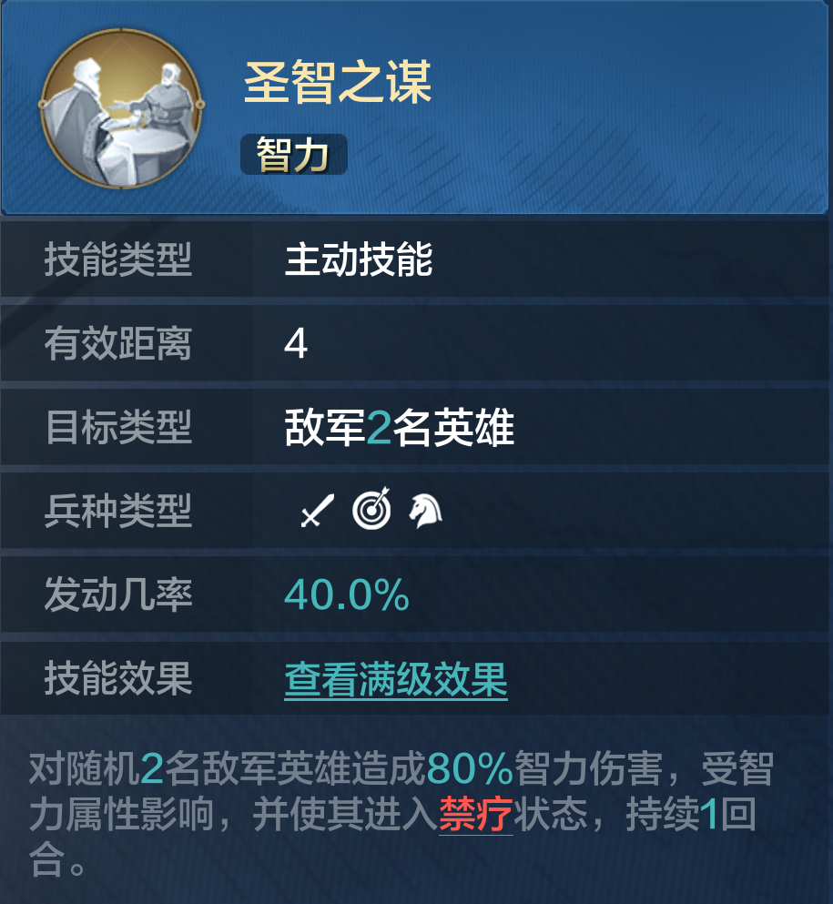 自身进入缴械状态(无法驱散),每当我军英雄受到伤害时,40%几率(受智力影响)恢复该英雄兵力(恢复率72%,受智力影响),每回合最多触发3次,每当敌军被施加减益效果,40%几率(受智力影响)使该效果延长1回合(混乱状态和按次数以及单回合内结束的负面效果除外),每回合最多触发2次。