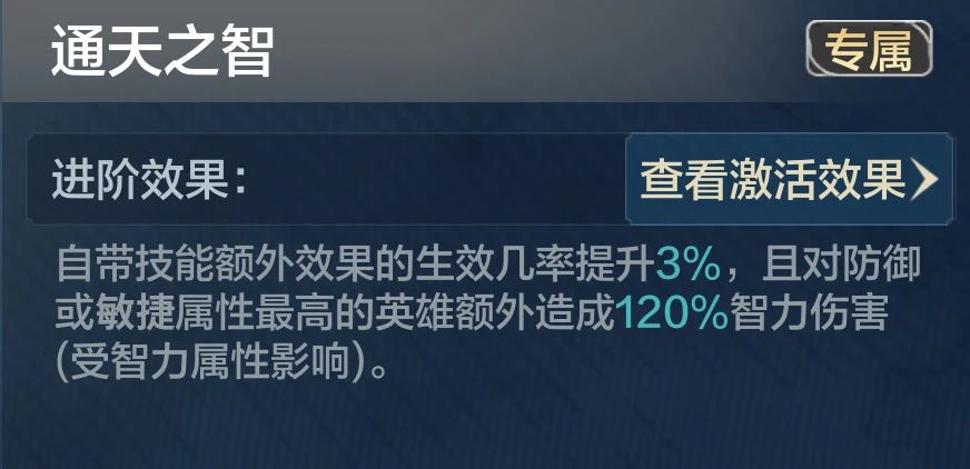 进阶效果:自带技能额外效果的生效几率提升3%,且对防御或敏捷属性最高的英雄额外造成120%智力伤害(受智力属性影响)。