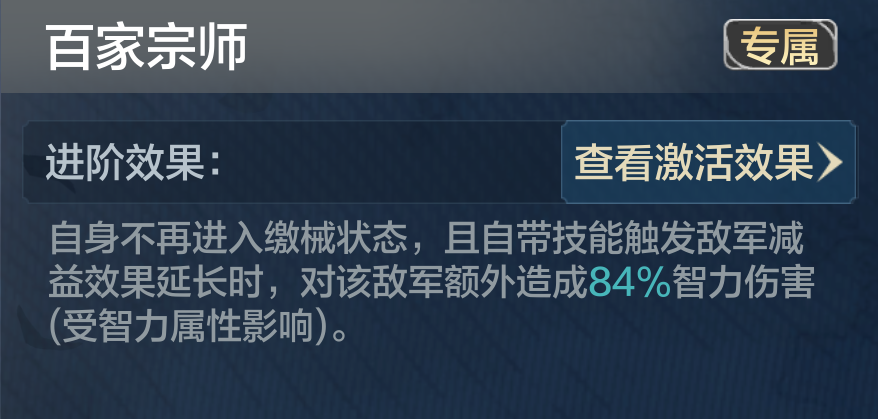 进阶效果:自身不再进入缴械状态,且自带技能触发敌军减益效果延长时,对该敌军额外造成84%智力伤害(受智力属性影响)。