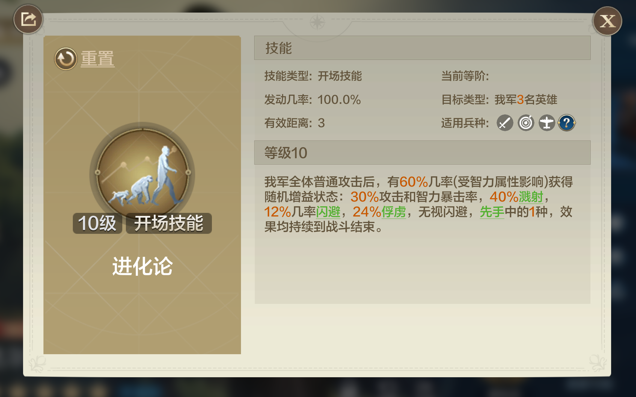 我军全体普通攻击后,有60%几率(受智力属性影响)获得随机增益状态:30%攻击和智力暴击率,40%溅射,12%几率闪避,24%俘虏,无视闪避,先手中的1种,效果均持续到战斗结束。