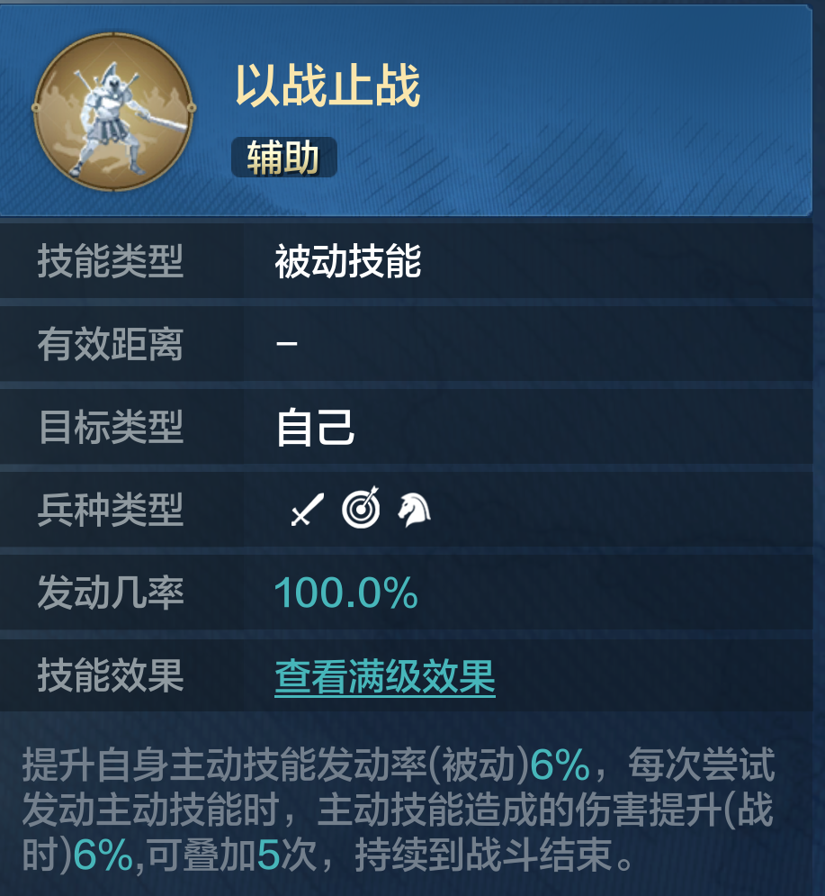 提升自身主动技能发动率(被动)6%,每次尝试发动主动技能时,主动技能造成的伤害提升(战时)6%,可叠加5次,持续到战斗结束。