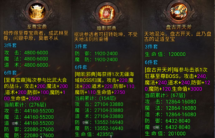 每层加成:攻击+200, 魔法+200, 道术+200, 防御+100, 魔防+100, 生命值+2500