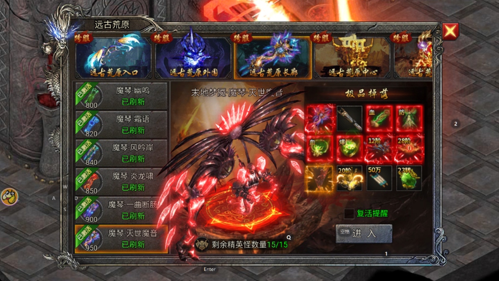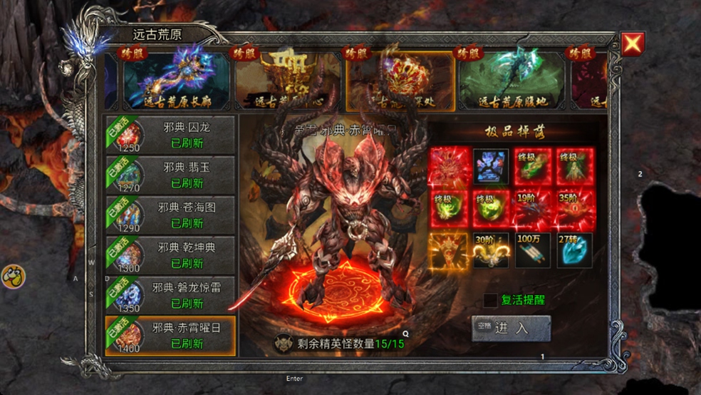 在远古荒原中,成功击杀首领有机会直接获得完整的古宝。此外,地图中的野怪也有几率掉落古宝碎片,收集足够碎片可合成为完整的古宝。激活古宝后,即可获得对应的属性加成与套装效果。每种古宝都能通过完成其特定的关联活动来强化属性,持续提升你的战斗力。