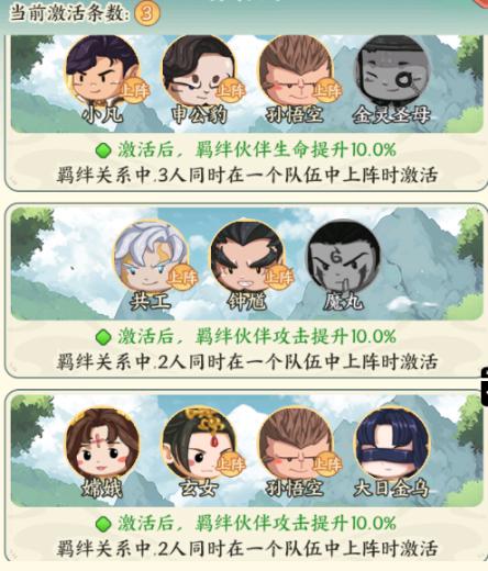 【羁绊突破】——激活三神共鸣,攻击+10%,暴击+10%,生命+10%,战力突破极限!