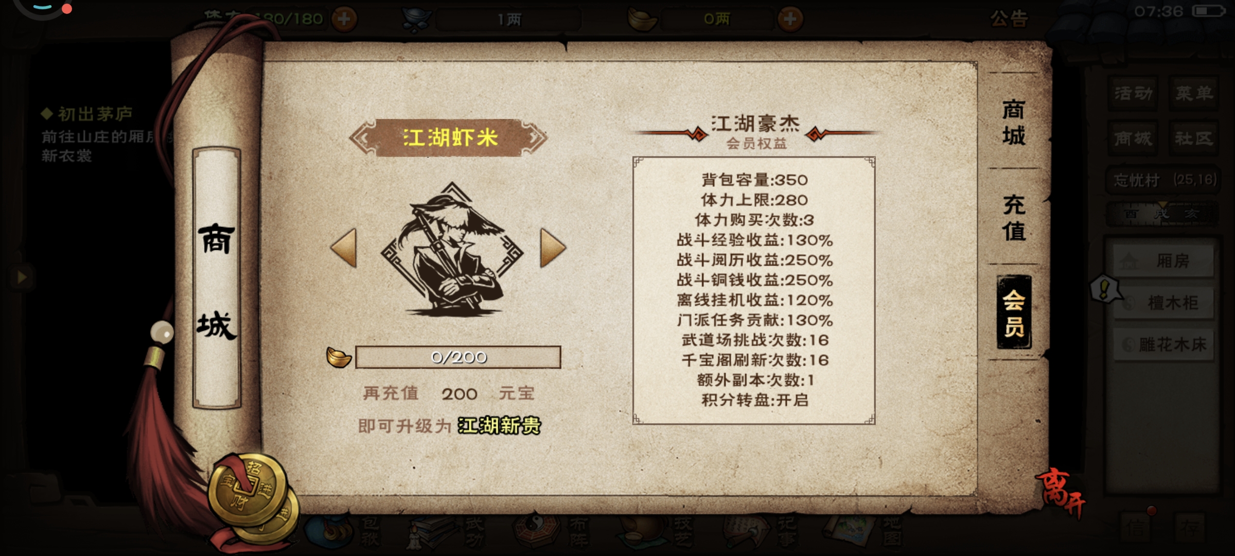 首先第一次创立开局角色,男女随便,名字随便天赋随便。进入游戏后开通小米畅玩卡会员,新用户9.9元开一个月,领取4张15元无门槛劵,98-20劵,328-50劵,68-15劵。进入游戏商场购买98元冲击基金,1个月30元月卡月卡 ,购买68元680元宝,328元3280元宝。实际花费416元, 累计获得大概9800元宝,游戏vip等级来到江湖豪杰,体力上限280。