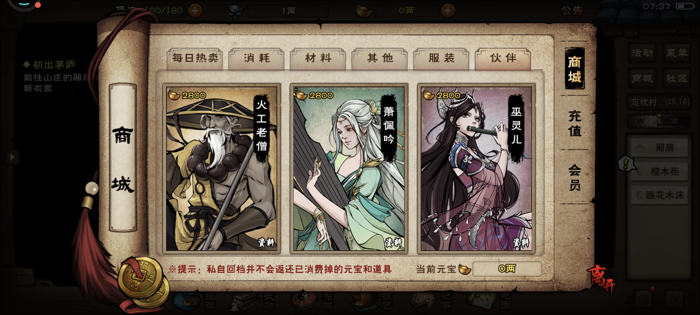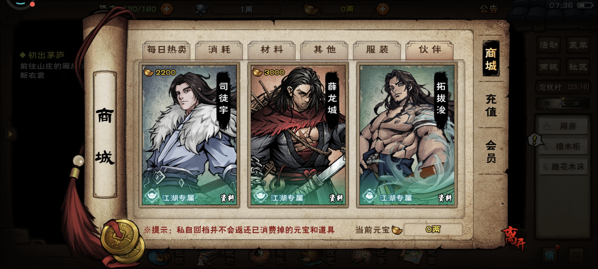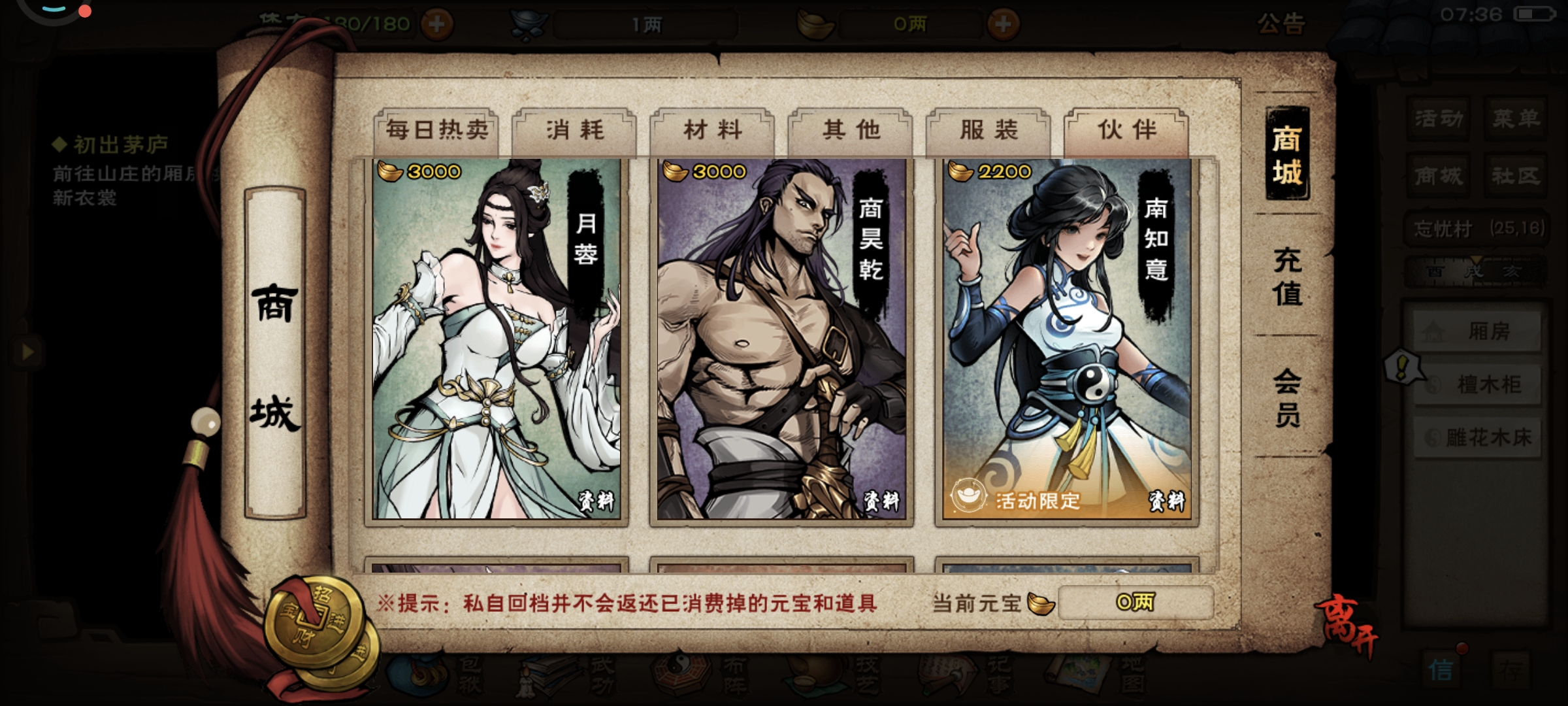 重新进入游戏,邮件里面的60体力先不要领取,快速进入商城伙伴页面购买商昊乾,火工老僧,薛龙城,上阵这三位伙伴,给商用刀,僧用货,薛用刀,同时给三位伙伴的武学升级,优先套路跟内功,轻功先不用管。看看有没有免费的马车票,没有的话去商城花150元宝买一个。然后快速推进忘忧村主线做完,把等级升到10级。去拜师天刀门(南阳渡-洛阳-落霞镇坐标20,19),学习门派武功,主角优先学习套路(刀法)跟内功。商的 武学-基础刀法-八卦刀法-流云刀法,