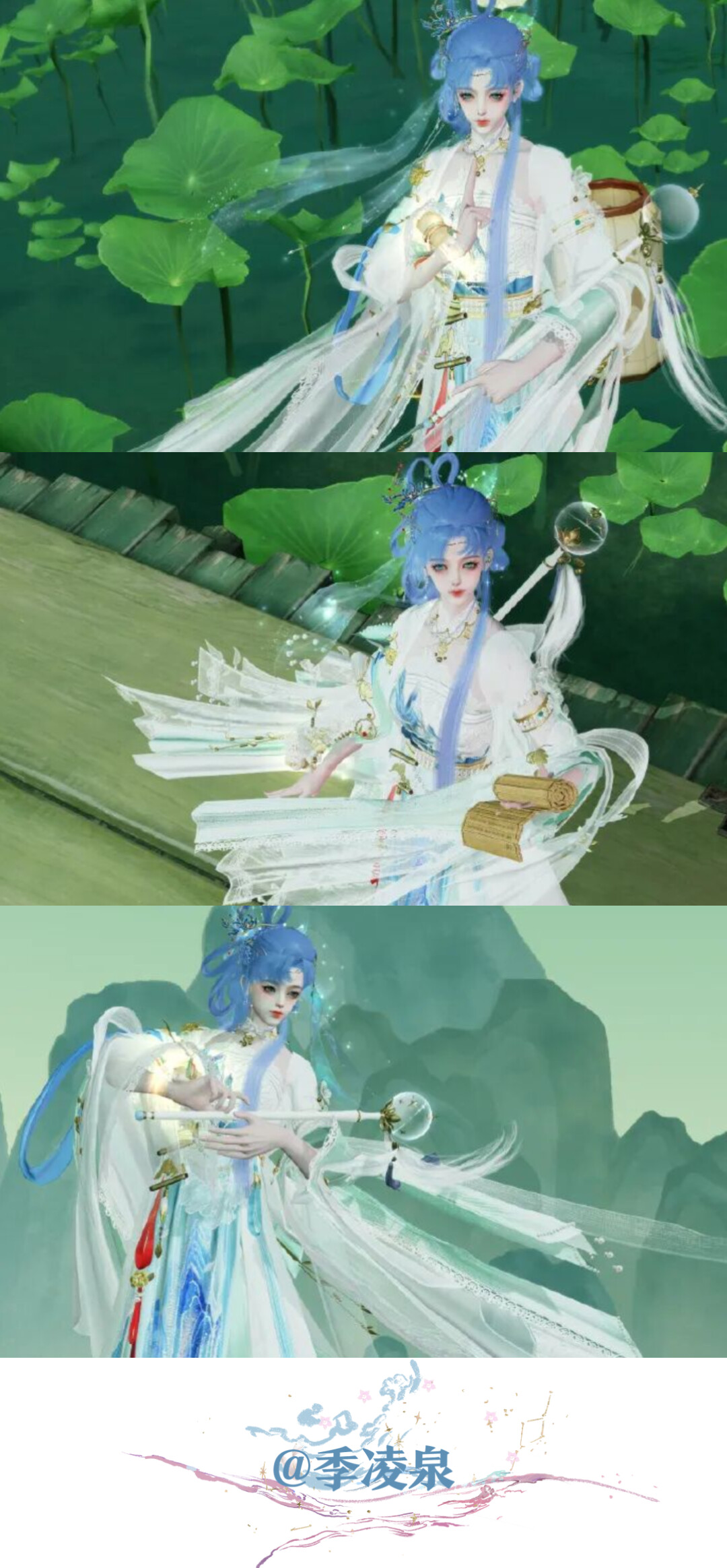色如雨后天青,荷旁近水呈碧,少侠@李泽言的门牙 将头发染色灵动的蓝,在池水与山川之间摆弄拂尘,出尘的气质中含了一抹欲说还休的意味,实在令小四看了也不禁沉醉......