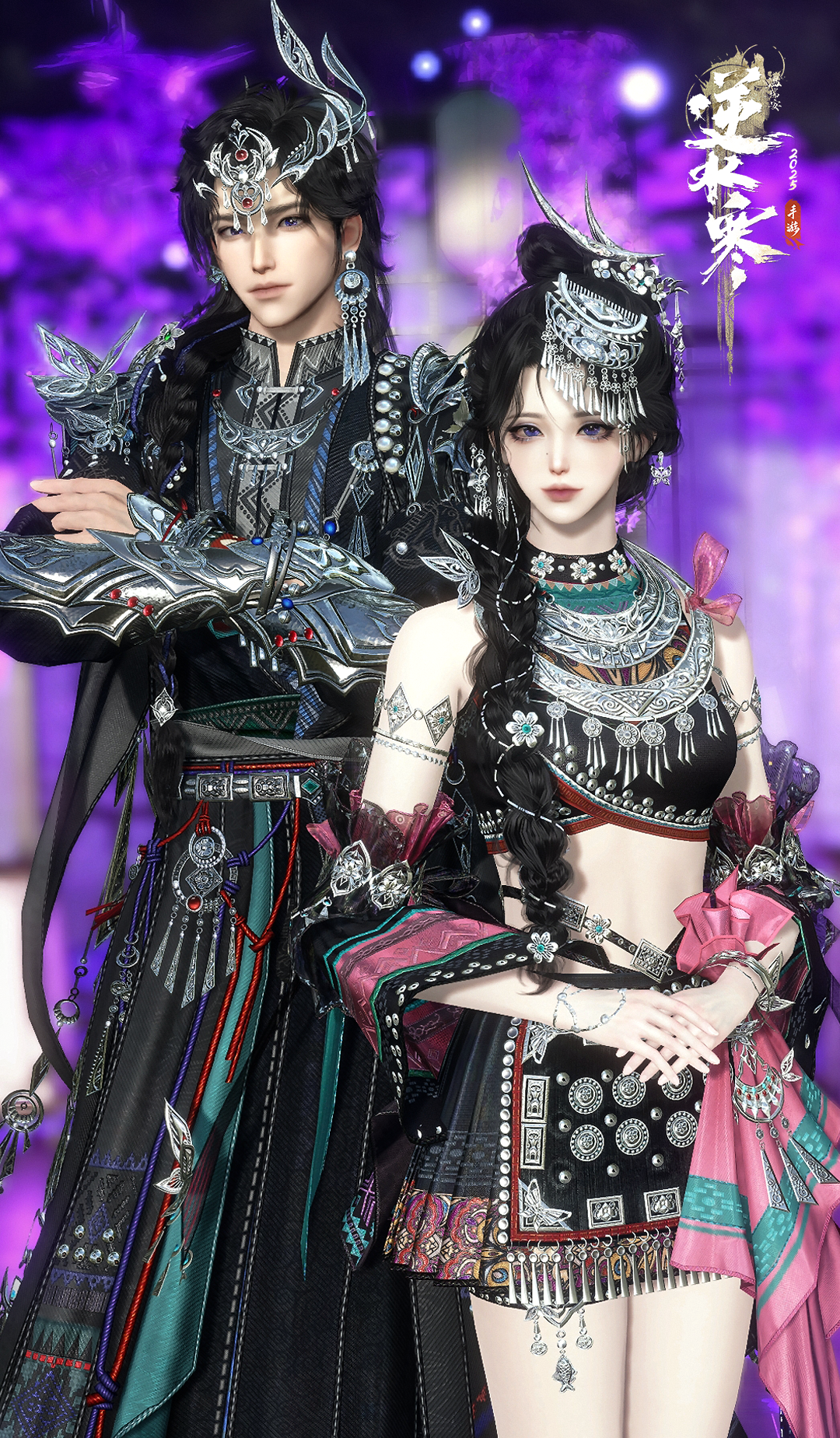 男款时装则尽显沉稳大气,立领对襟黑色长衫版型挺阔,大量刺绣和银饰更添一份精致与华贵。