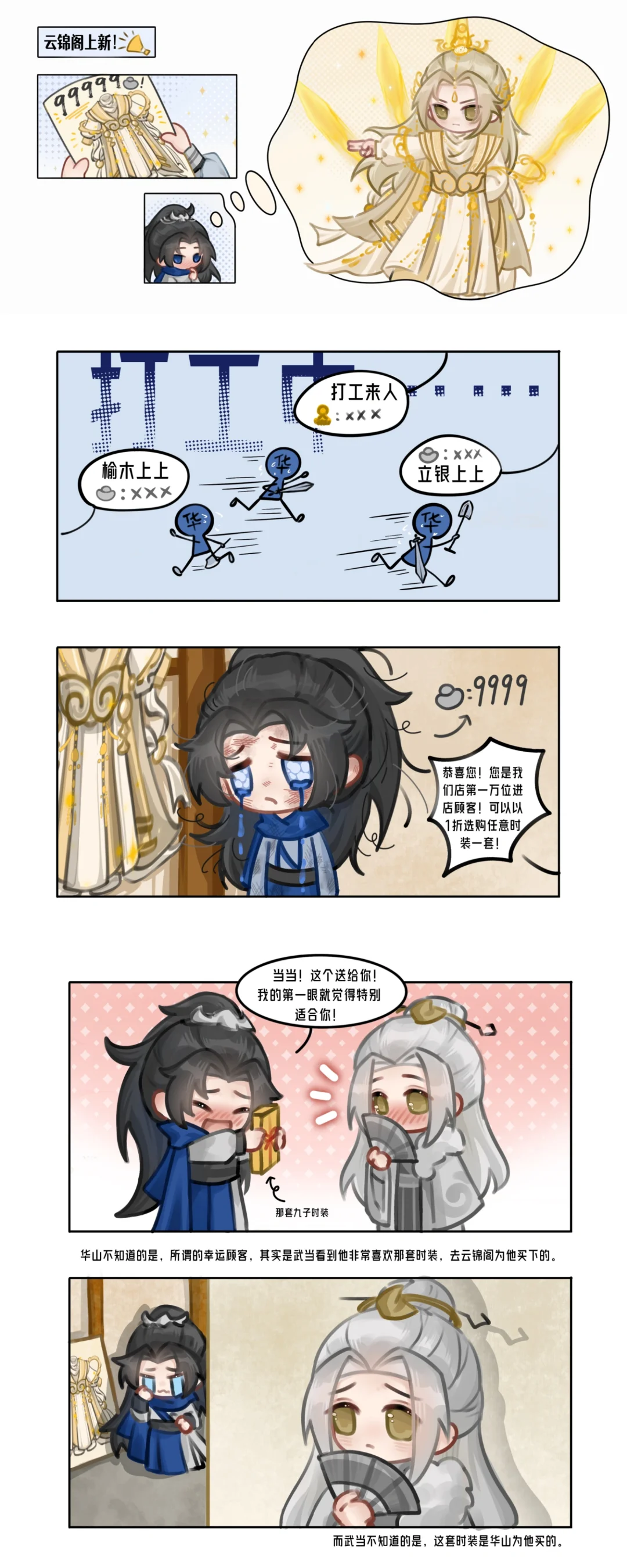 少侠@椰Ani 用细腻的笔触绘制了华山和云梦的小剧场,只见云梦弟子发现了背后偷偷摸摸跟踪的华山并投以微笑,华山os:她对我笑了,她是不是喜欢我?