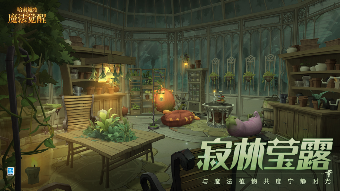 雨滴簌簌,在叶片上敲击清脆鼓点;穿过澄澈的半透明墙壁,微风轻声吟唱;毒触手、泡泡豆荚、魔鬼藤...万物生长,奏响喜悦而欢快的丰收乐章。对醉心于魔法植物种植的巫师而言,这里便是绝赞的植物乐园!