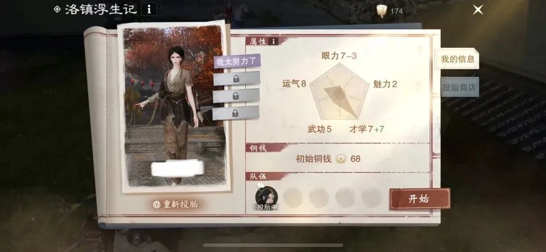少侠将会重新投胎,成为一个不会武功的普通人,但同时也身怀各式天赋。在洛镇,你需要做的只是活下去,坚持生存七天,便是胜利。是在垃圾堆和泔水桶中摸爬滚打,还是凭借一技之长出人头地,抑或是刚刚投胎便又去投胎,一切皆在你的选择。