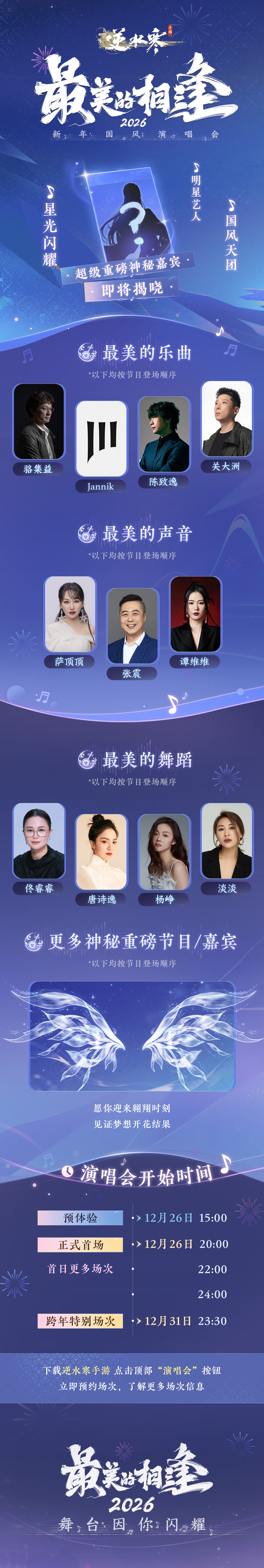无论您身在何时,身处何地,我们都希望您能在12月26日,与身边之人一起,共赴逆水寒最美的相逢2026新年国风虚拟演唱会。