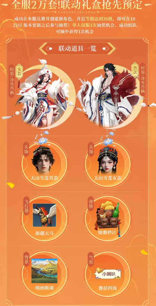 参与即有机会获得绝版联动奖励:包括【净雪丹枫】主题时装、天山雪莲定制头饰、灵动背饰“锦囊妙计”、坐骑“新疆天马”等珍稀好礼,更有限定“妖精女”手办惊艳登场!