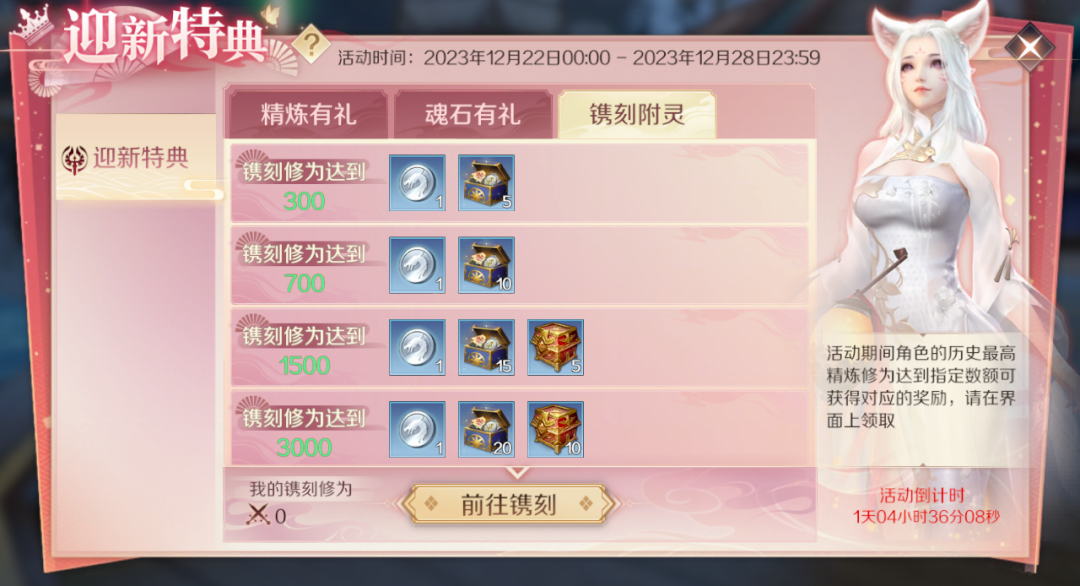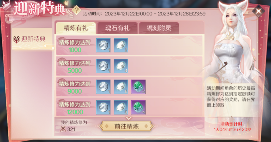 迎新特典活动将持续7天。在精炼有礼魂石有礼镌刻附灵中,修真者在活动期间,精炼修为以及魂石修为达到指定数额则可获得对应的奖励,超多银币乾坤石等道具福利等你领取。