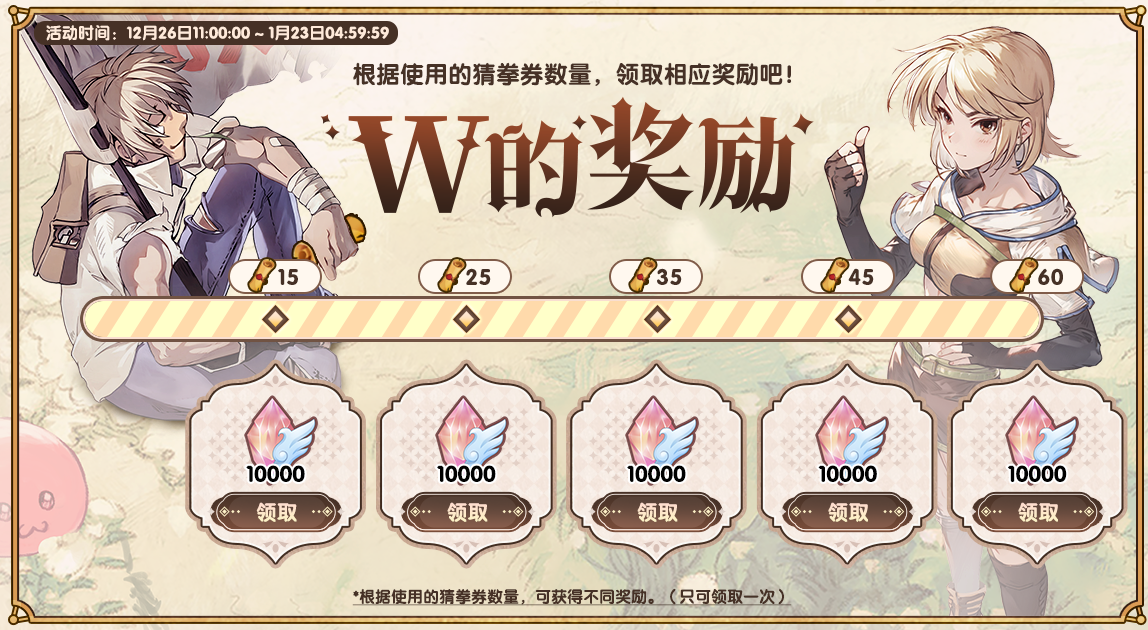 「W的奖励」:活动期间使用的猜拳券达到一定数量,即可领取相应的水晶奖励。