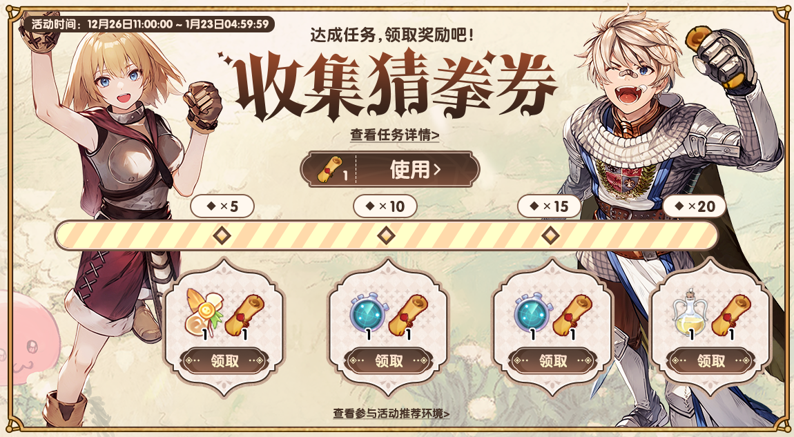 「收集猜拳券」:活动期间可通过完成日常副本、公会订单、委托板等活跃任务,累积活动积分,积分达到一定数量时,即可领取委托令、宠物雷达、活力药水和猜拳券奖励;