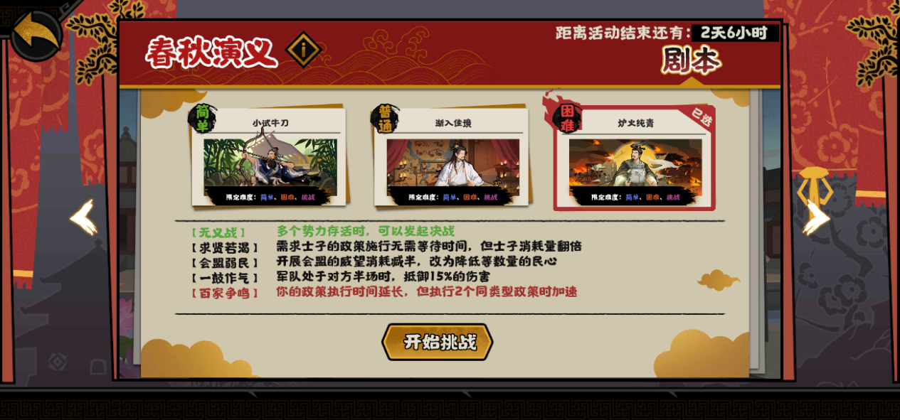 春秋演义也将于10月31日至11月2日返场,还没解锁剧本的王上也能参与体验哦,让我们一同领略春秋时期诸侯纷争、百家争鸣的历史风云。
