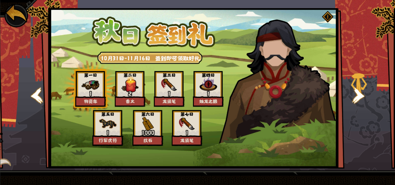 10月31日至11月16日,秋日签到礼登场。活动期间每日登录即可领取龙须笔、物资车、香火、烛龙之眼等丰富道具奖励。秋高马正肥,助王上驰骋华夏。