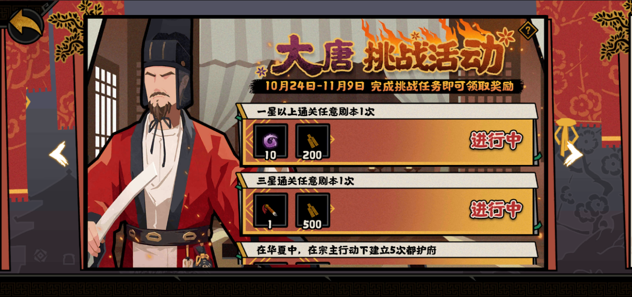 与此同时,新的剧本挑战活动也要登场了!10月24日至11月9日,大唐挑战活动上线!活动期间完成挑战任务即可领取奖励,玄玉、纹石等你来拿!