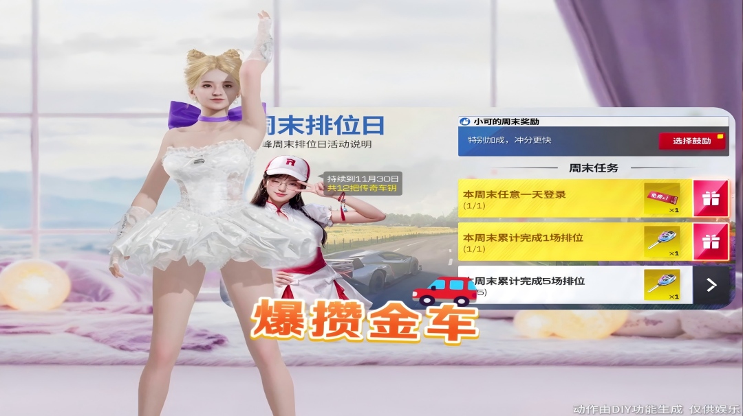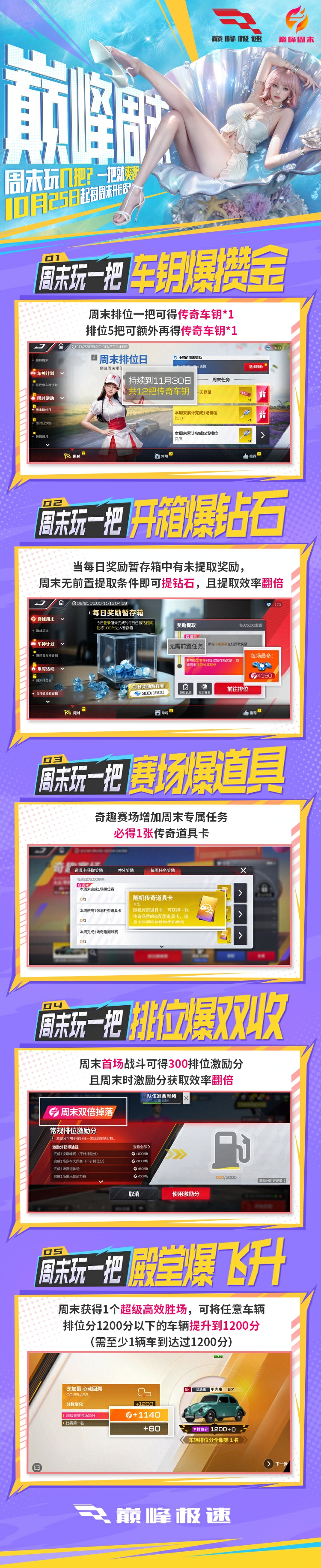 小可宣布,「巅峰周末」已全面爆改升级!无论你是一周疲惫、上分没动力,还是状态暂时掉线,只要周末上线玩一把,小可就能用海量福利,帮你把竞速热情重新点燃,把自信能量全部加满!