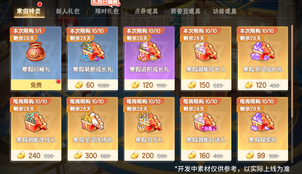 寒假特卖礼包上线,小西普们可前往[商城]—[培养]—[寒假特卖]购买需要的特卖礼包