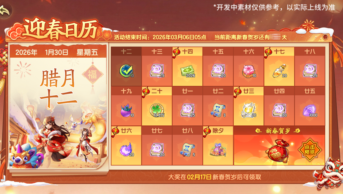 过了腊八就是年!喜迎新春,活动期间内每日打开日历签到即可领取相应的道具好礼,每签到一定天数当天签到可获得1份大奖,大奖将存入新春贺岁礼包中,在2月17日春节后登录即可领取所有存入的大奖!
