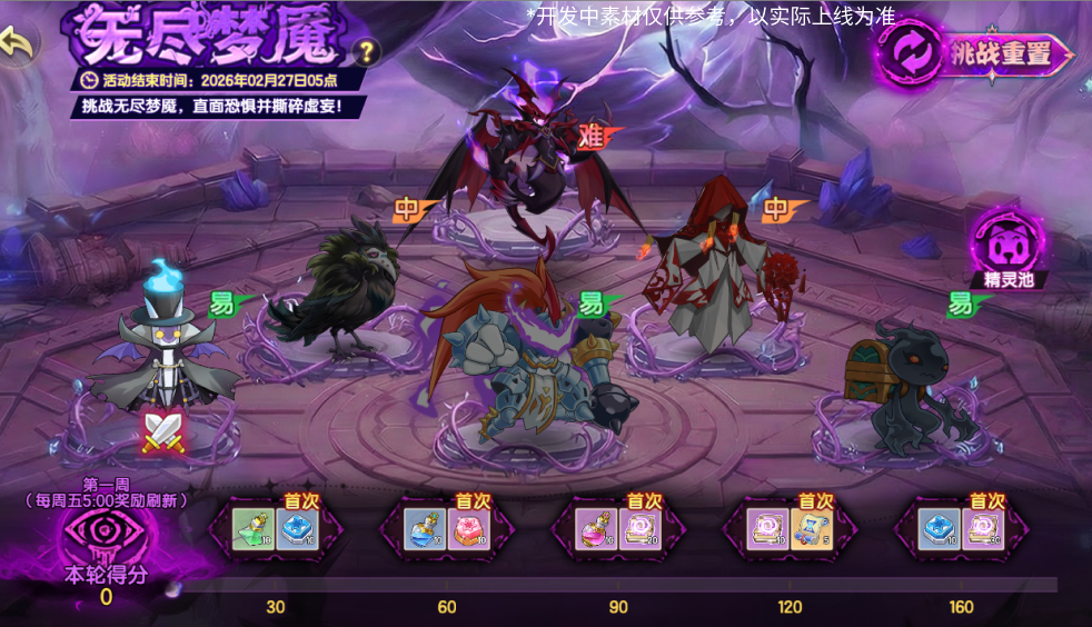 挑战无尽梦魇,直面恐惧并撕碎虚妄!活动期间内每周将轮换6位挑战对手,使用系统提供的精灵搭配组合,击败对手获取积分可解锁当周进度宝箱,挑战要点: