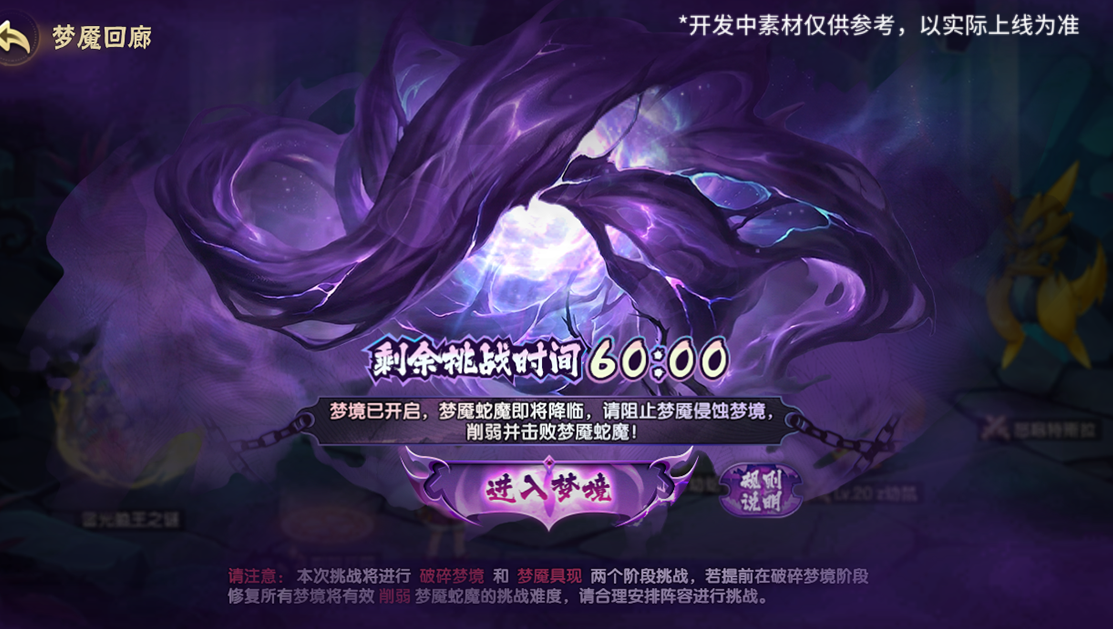梦魇具现:迎战孵化具现的梦魇蛇魔,梦魇蛇魔的孵化进度决定了挑战难度。