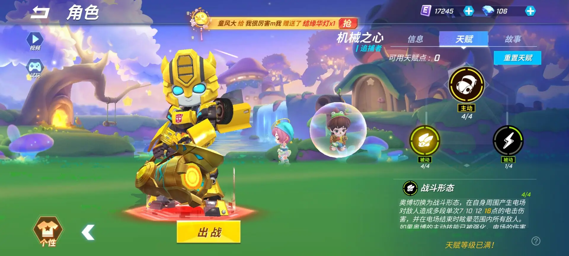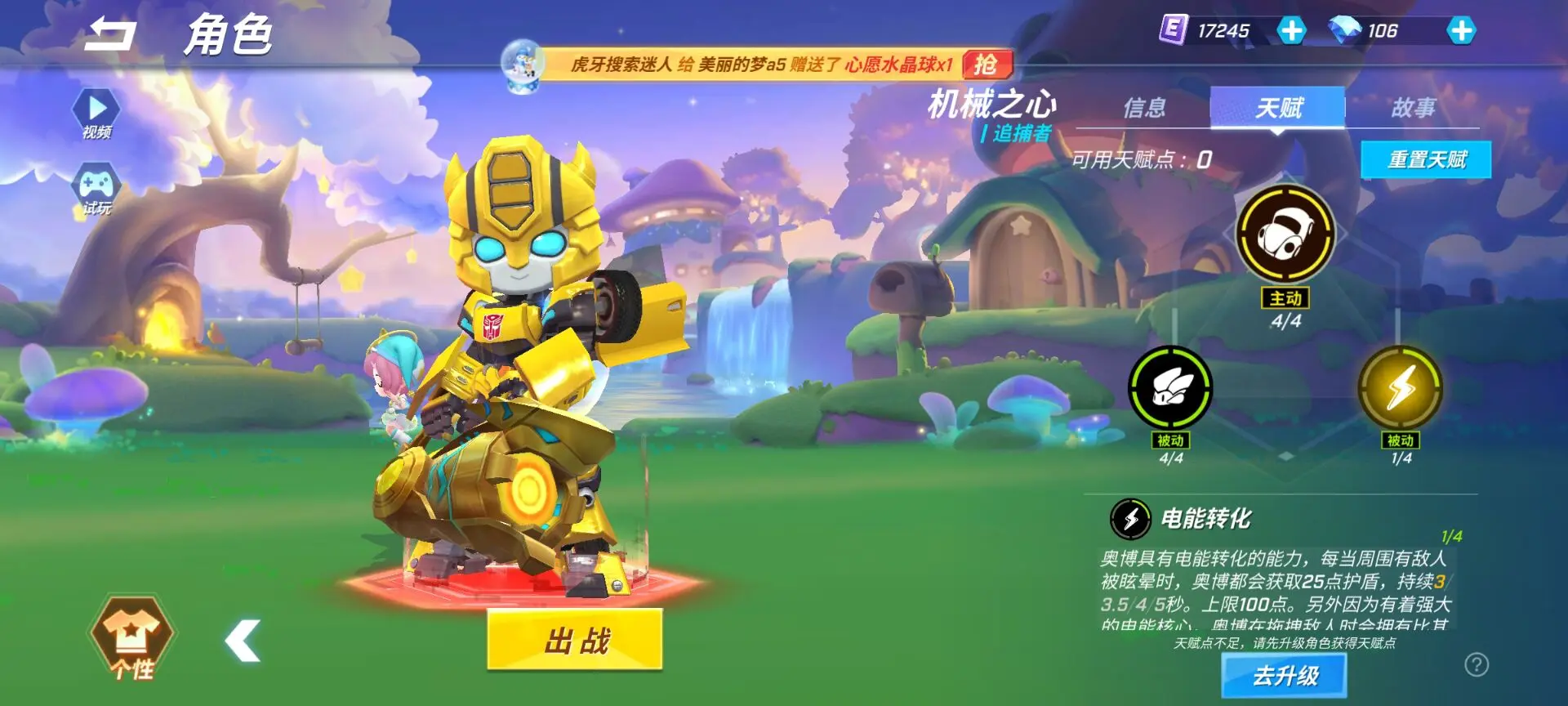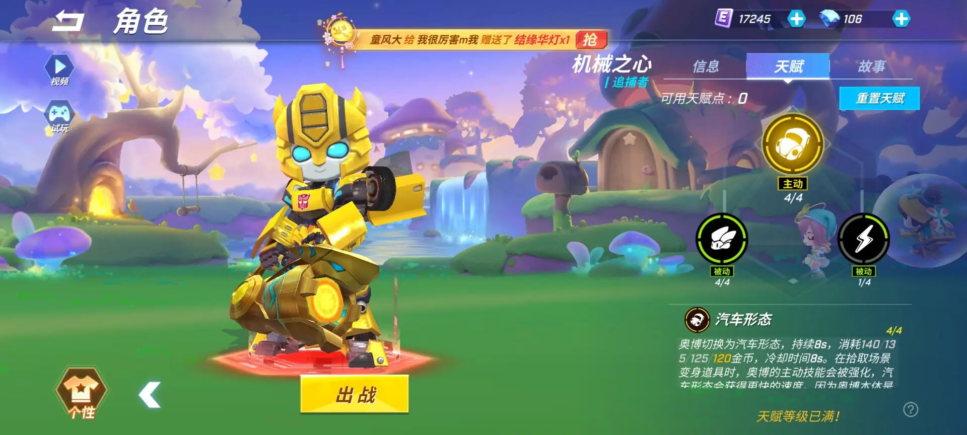 汽车形态的高额加速可以使你在地图中快速穿梭,具备了前期快速抓人的能力,且主动技能冷却时间短,行驶距离长,使他在前期具有极高的压制能力。