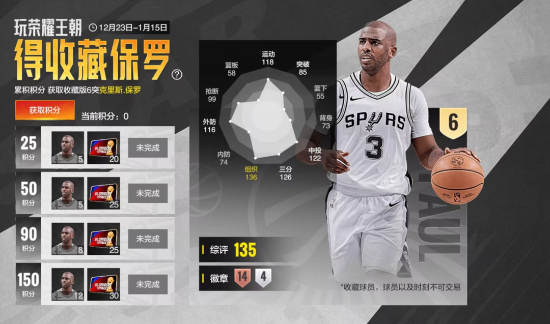 2025年12月23日~2026年1月15日,玩家们可以通过参与“玩荣耀王朝,得收藏保罗”活动,通过完成任务,即可获得满突马刺保罗,请各位玩家千万不要错过!