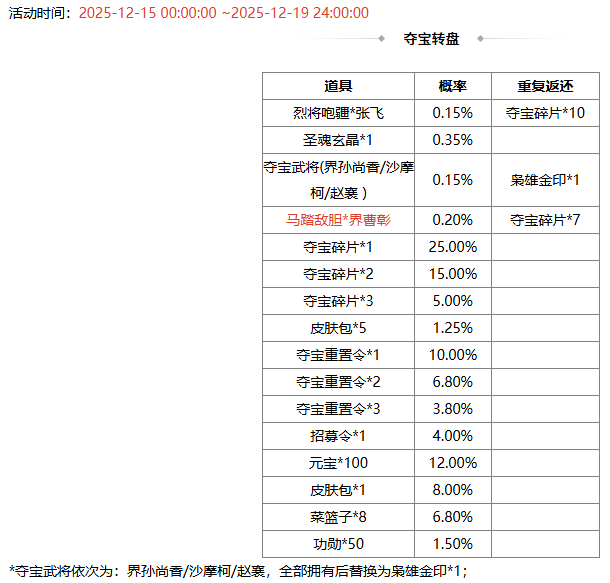 *2025-12-15 00:00:00 ~2025-12-19 24:00:00,马踏敌胆*界曹彰 70夺宝碎片、烈将咆疆*张飞 100夺宝碎片 限时上架夺宝商店。2025-12-20 00:00:00 起,马踏敌胆*界曹彰、烈将咆疆*张飞 下架。