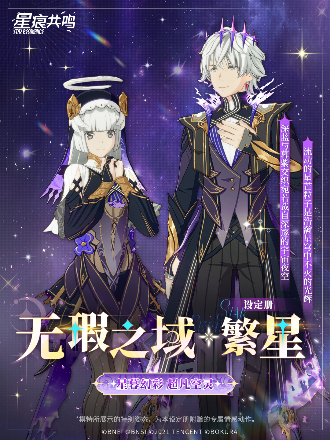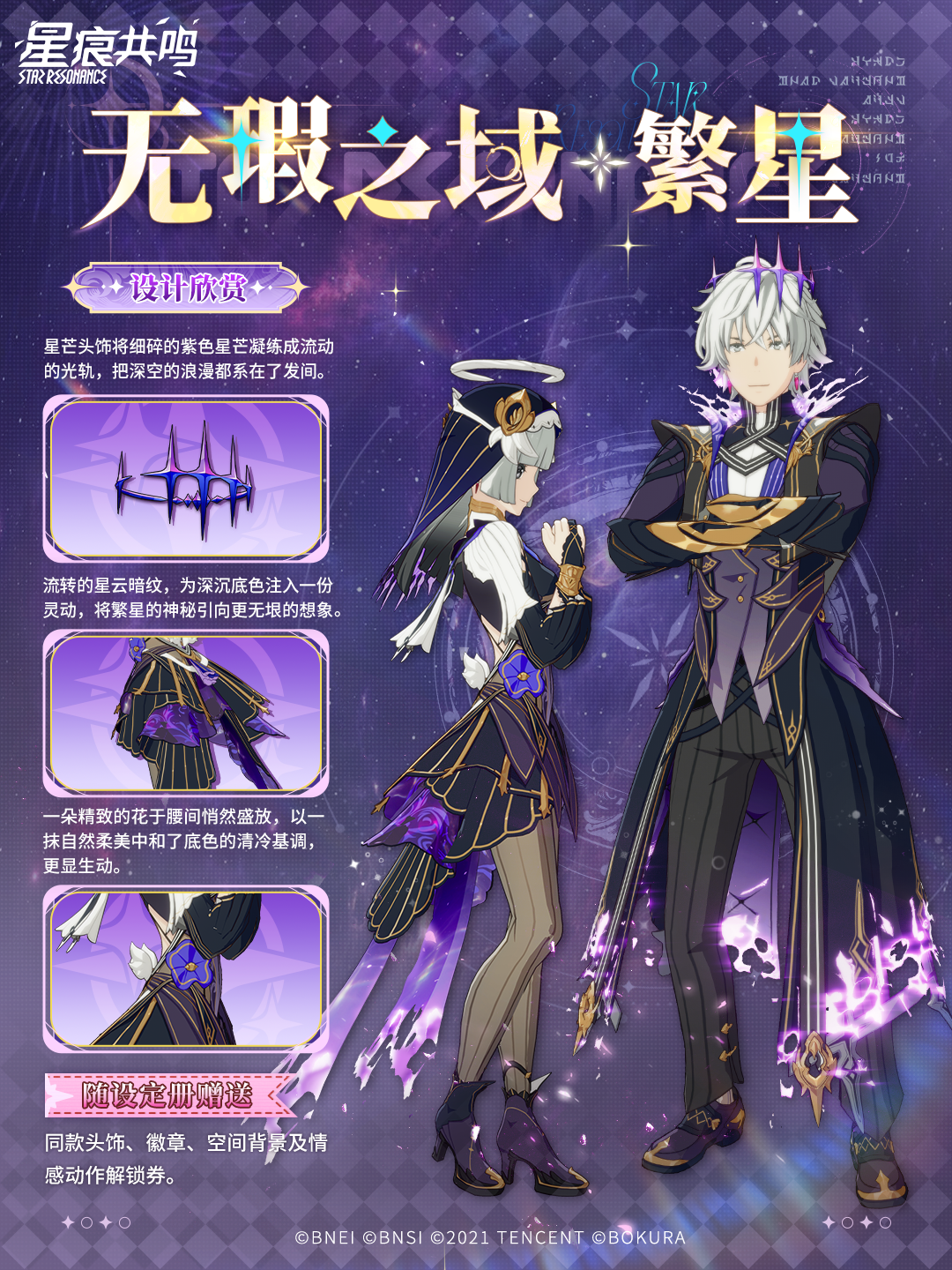 随设定册赠送系列单品、徽章、空间背景及情感动作解锁券。让这套超凡空灵的设计,更完整构筑你专属的星空。