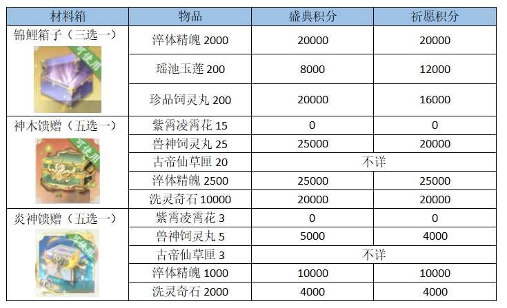 3、灵兽盛典/祈愿:神木馈赠25000/20000分>锦鲤箱子20000/16000分>炎神馈赠5000/4000分;