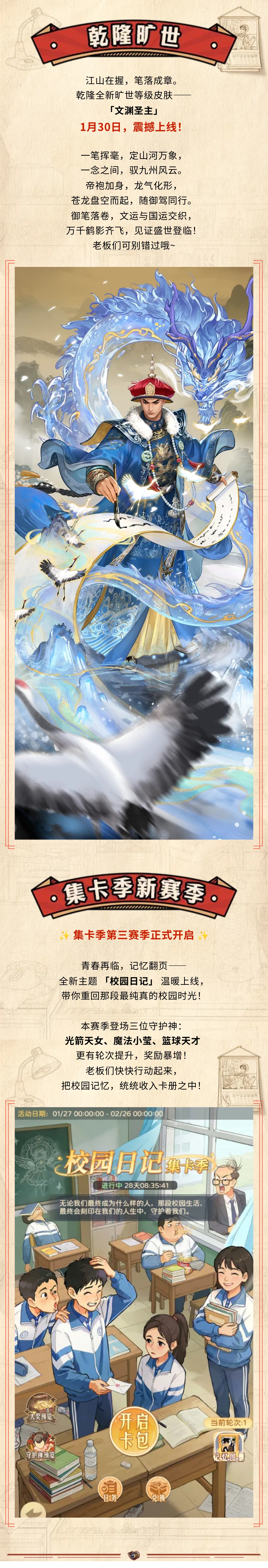 【时光快报】乾隆旷世皮肤「文渊圣主」即将上线,集卡季第三赛季火热来袭!