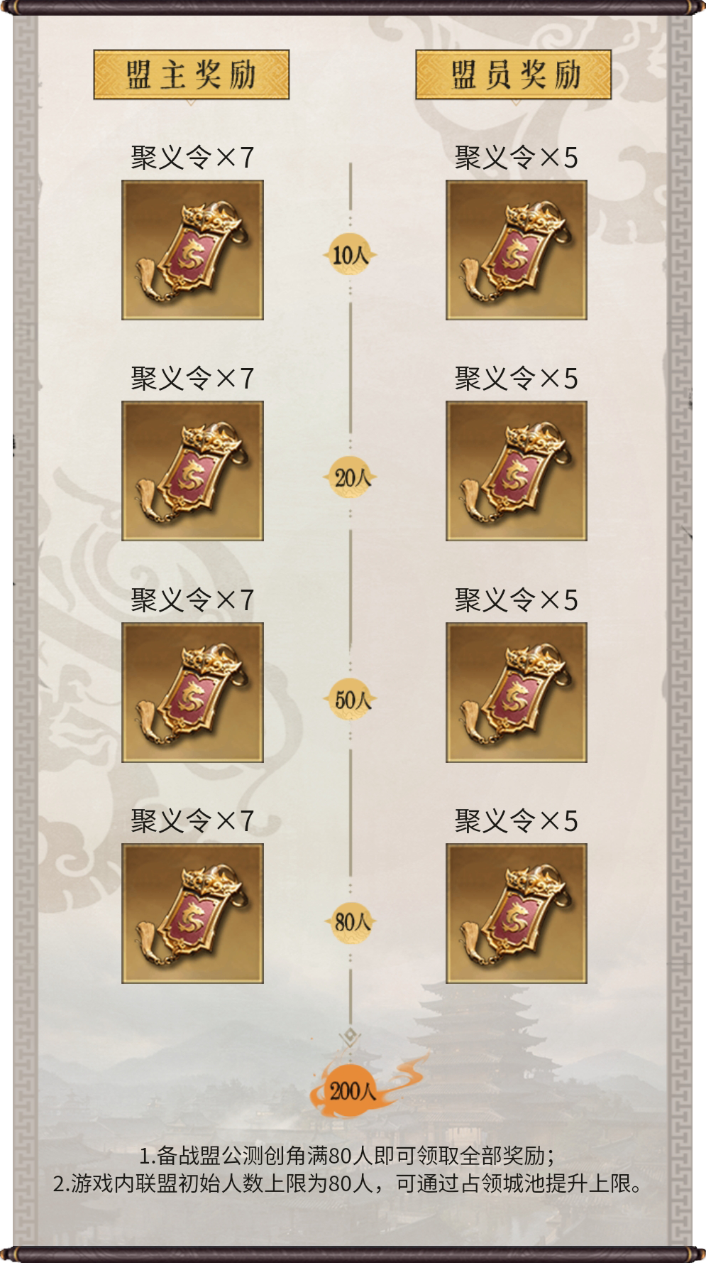 备战公测在即!主公现在预建联盟或加入联盟,当备战盟在公测时创角满80人,全盟最高共同赢取4008抽,价值超3万元!除此之外,加入备战盟活动,主公享有: