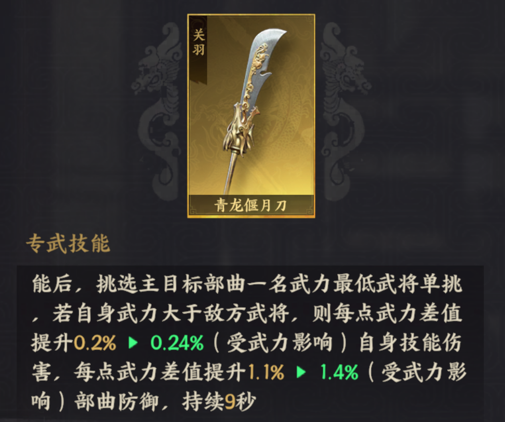 关羽的专武【青龙偃月刀】在发动技能后可进行“单挑”,根据武力差提升自身技能伤害和部曲防御,在持久战中极具威胁。