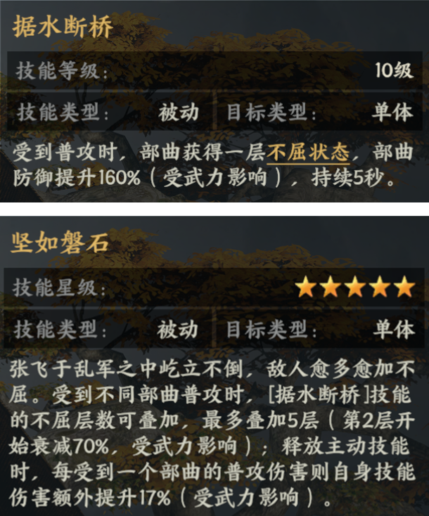 张飞的被动【据水断桥】在受到普攻时叠加防御,配合兵书【坚如磐石】效果,受到攻击越多,防御越高,主动技能伤害也越强。