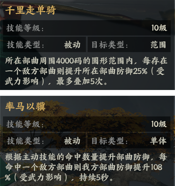 关羽的被动【千里走单骑】能在团战中获得巨额防御加成,【率马以骥】也根据技能命中数量提升防御,让部曲能在乱军中屹立不倒。