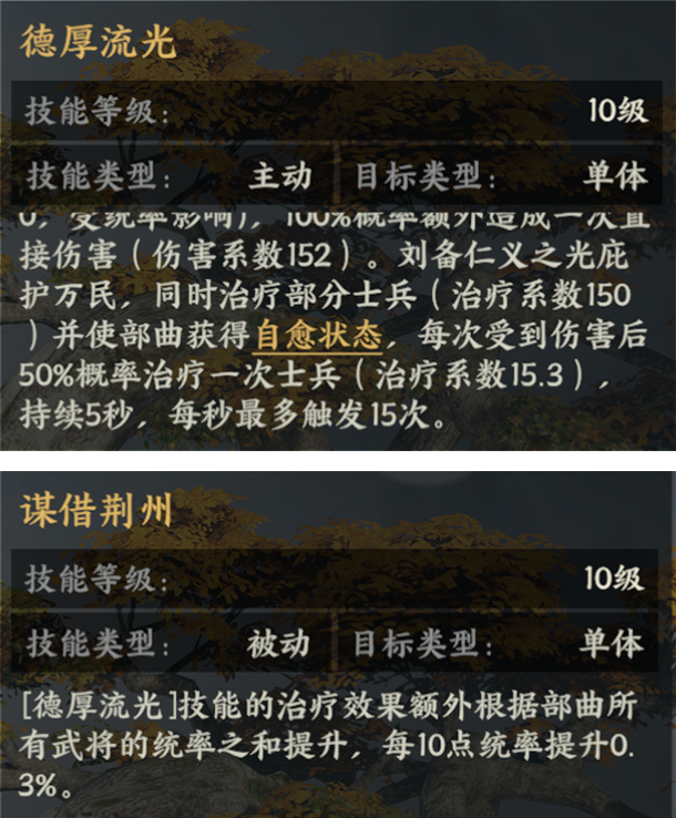 刘备的主动技能【德厚流光】可在造成伤害的同时治疗自身部曲,被动【谋借荆州】更能基于统率大幅提升治疗效果,为队伍提供了稳定的续航支持。
