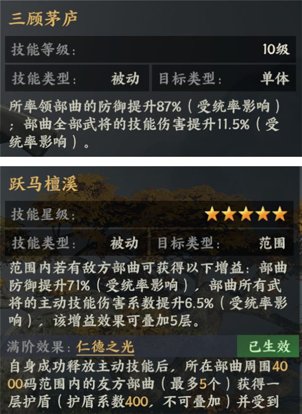 刘备的被动技能【三顾茅庐】提升全队防御,兵书【跃马澶溪】在交战时根据范围内敌方部曲数量可进一步提升防御与主动技能伤害,满阶后释放主动技能还能为友军添加护盾,攻防一体。