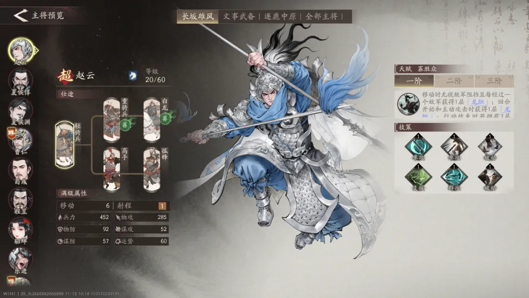 赵云是超级别强力骑兵/短兵系主将。天赋【寡胜众】可以让赵云无视敌军阻挡,独特的龙胆机制可以让赵云大大提升生存能力。加上赵云丰富的伤害/救援技策,可以让赵云真正成为战场上七进七出的猛将。