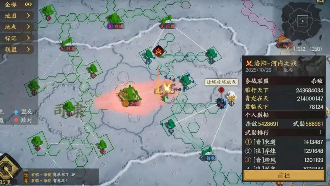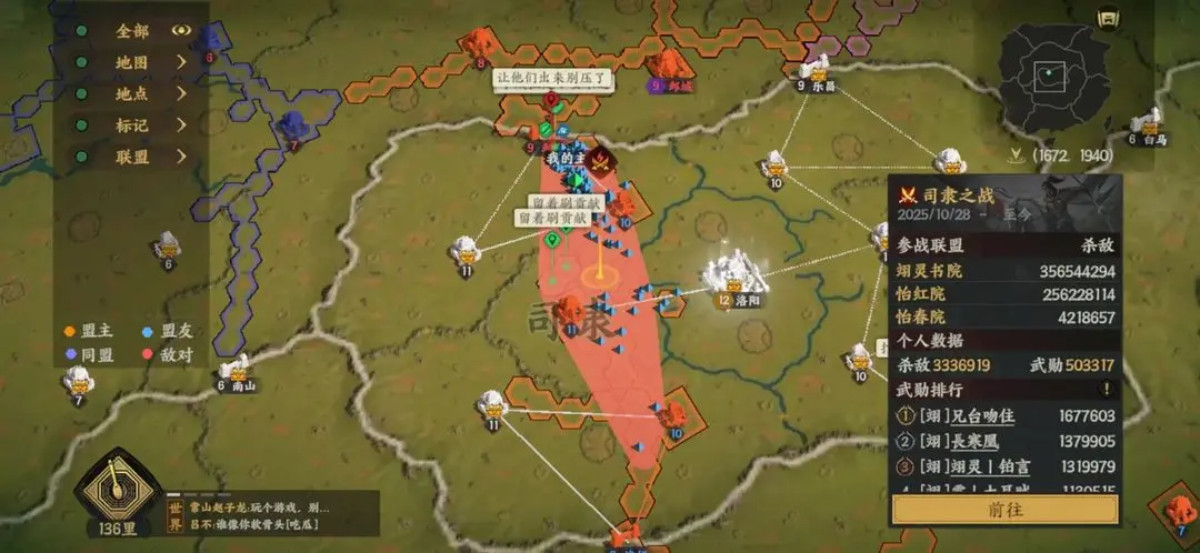 最抽象的还得是在洛阳,决战关键时刻,二盟竟因距离过远无法及时抵达战场,主力在前线望眼欲穿:说好一起打团,队友呢??!最终【怡红院】含泪退出洛阳。但人家不放弃!正和二盟重新规划战术,准备换个关口再战——兄弟,这次可不能掉链子了!
