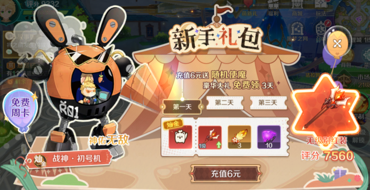 1、首充福利必拿 •6元新手礼包:首日登录即送红装武器(可用至40级)、灿金使魔随机*1、命运之羽*3,直接提升开局战斗力。
