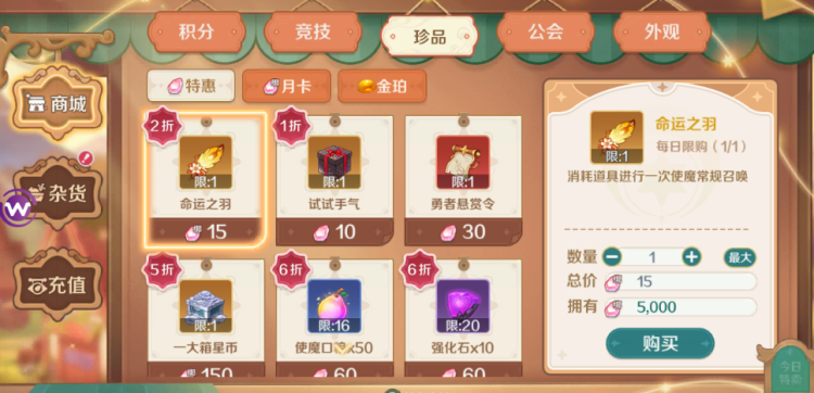 •珍品晶珀商店 用日常获得的金珀兑换灿金使魔、神使信物等稀有资源。 •珍品特惠商店 推荐每天清空命运之羽(15绑钻)+手气礼包(10钻)+勇者悬赏令(30钻);其他礼包有6折或者以下的都可以优先选择购买。