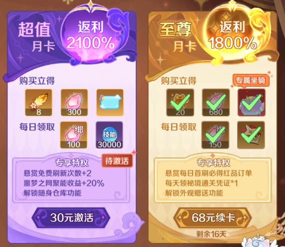 2、 月卡双倍收益 •至尊月卡(68元) 性价比最高!立得灿金使魔碎片*20(可合成灿金使魔)、变色龙盲盒(专属坐骑)、每日绑钻*150和装备密令*1。