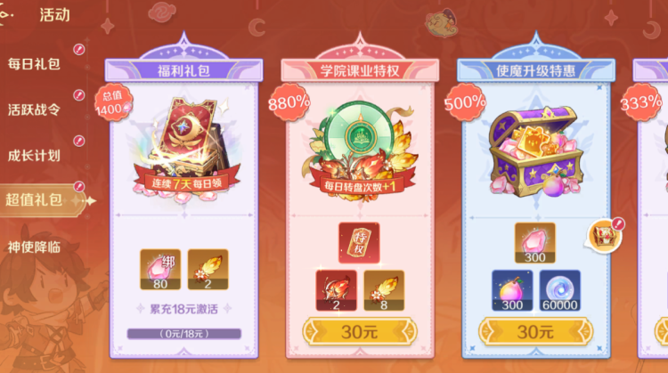 4、超值礼包: 优先购买30元学院课业特权(每日转盘次数+1)