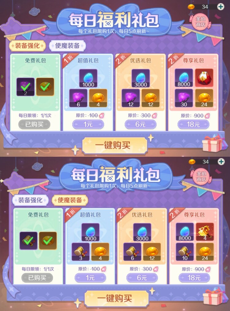 5、每日必氪和商店兑换 •每日礼包(50元) 装备强化礼包+使魔装备礼包,加速装备毕业。