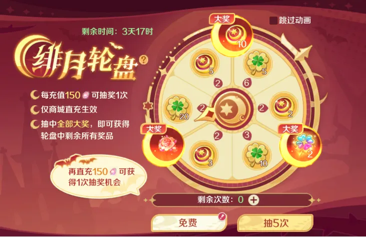 3、轮盘奖励为不放回抽奖。一共有3份大奖和多份普通奖励,每格有不同份数的奖励,每次抽取只能获得一份;