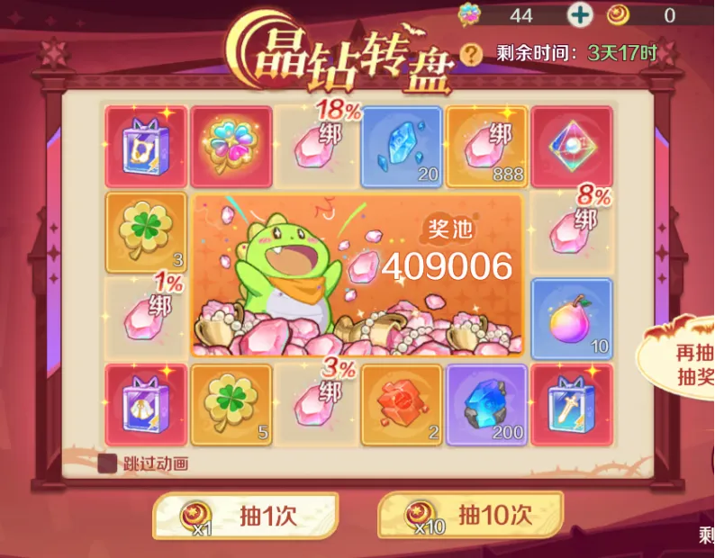 活动规则:每直充200晶钻可以获得一次抽奖次数(不计算额外附赠的晶钻),每次抽奖有10绑定晶钻累加到奖金池中。奖池保底金额40w绑定晶钻,封顶为80w绑定晶钻,封顶后不再累加奖池。 另外还有进阶抽奖,奖励不会重复获得,当前轮次奖励全部抽完后进入下一轮。