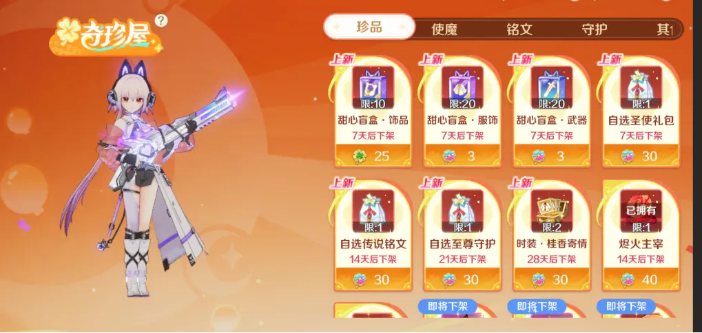 奇珍屋迎来【甜心盲盒系列服饰,武器,饰品】等礼包;还有【自选圣使礼包】【自选传说铭文礼包】【自选至尊守护礼包】齐齐上阵啦,还没有获得的小伙伴,蹭这个机会,快来奇珍屋看看吧!机会难得,别错过哦!